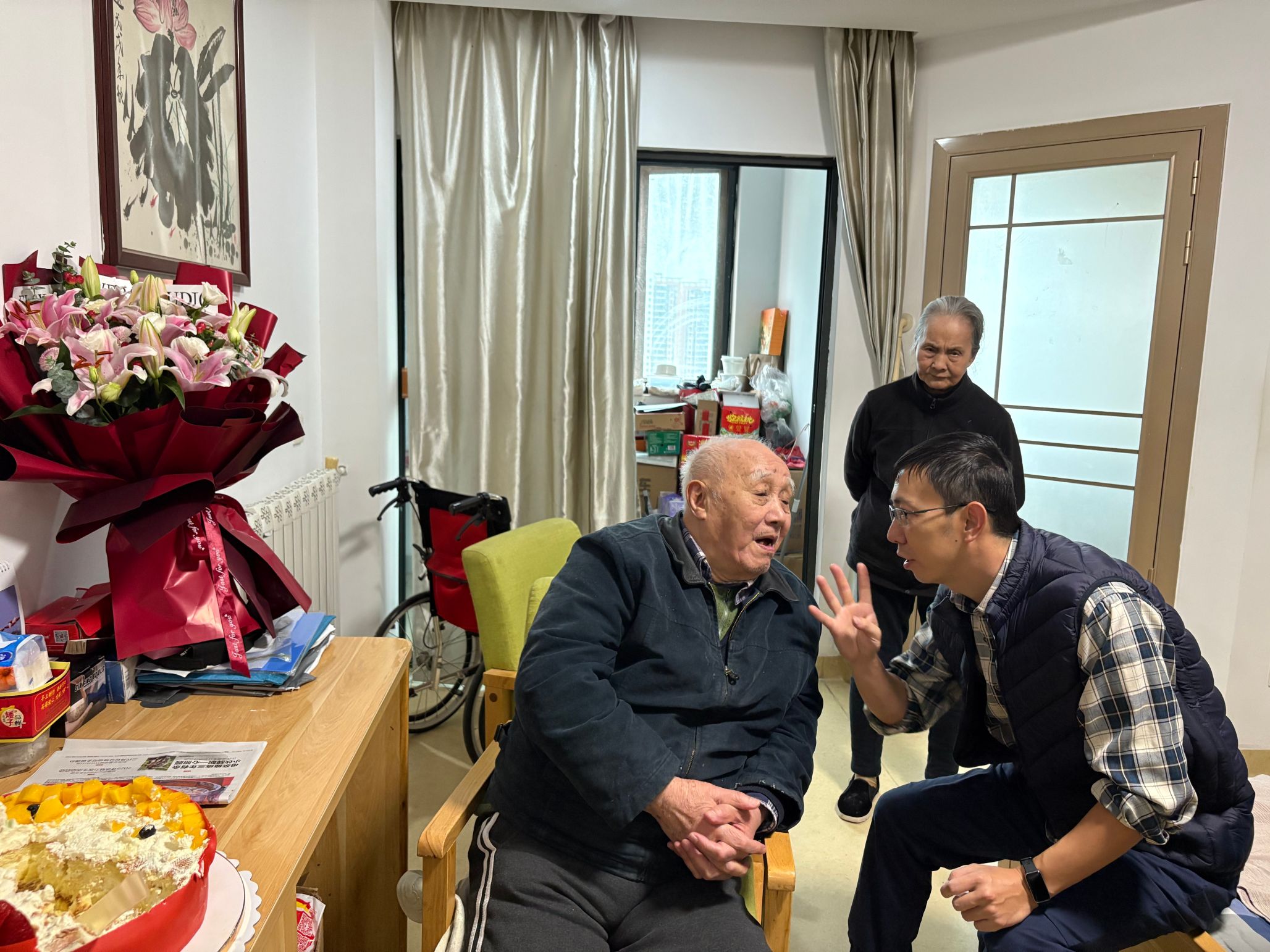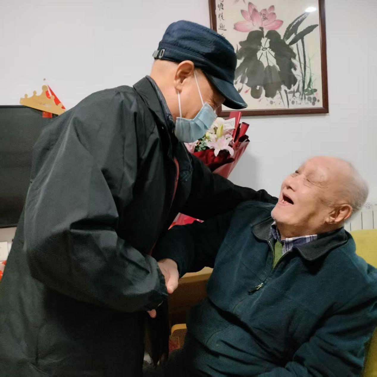 走进徐文思教授的居所,梁涛书记首先代表学院全体师生送上最热烈的生日祝福,递上精心准备的蛋糕与鲜花。她紧握老人双手,细致询问饮食起居与身体状况,反复叮嘱老人家保重身体、安享晚年。