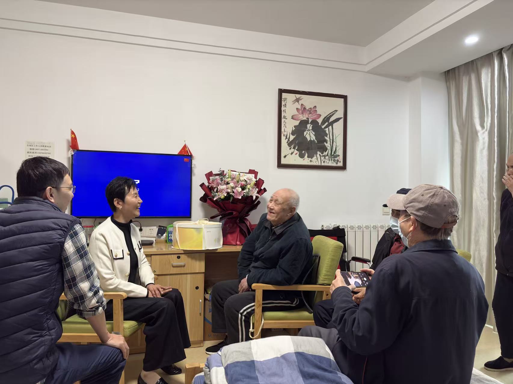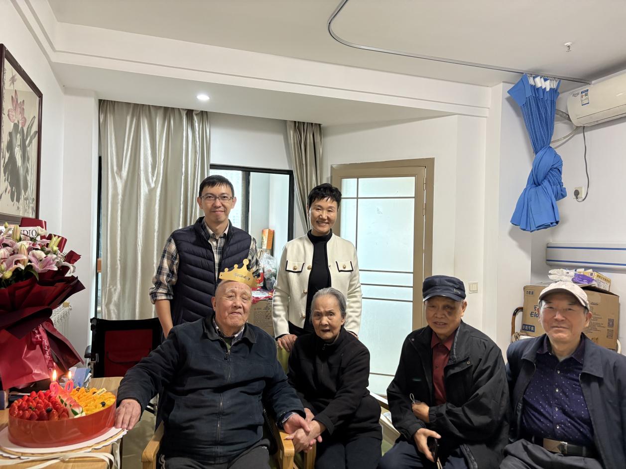 2025 年 10 月 31 日,学院党委书记梁涛带队,与离退休第一党支部书记刘兴国、学院老协副会长李安明、公共事业管理系党支部委员孙杨及学院党政办副主任黄睿春一行,专程前往洪山区社会福利院,为在此休养的徐文思教授庆贺九十大寿。
